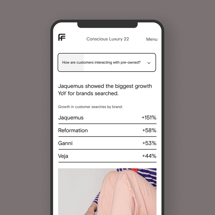 Even with compelling evidence, data can’t always speak clearly for itself. The site structured data around thematics and trends aligned with Farfetch's sustainability initiatives. This informed site navigation and provided natural onward journeys to related resources.